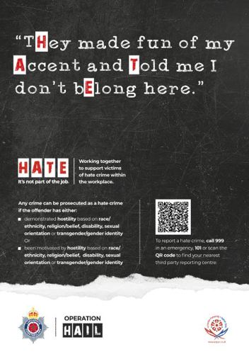 All this week, as part of Hate Crime Awareness Week, officers will be visiting business premises to talk to employees about Op Hail, ensure they have a full understanding of what constitutes a hate crime and where they can access support in reporting and sharing evidence.